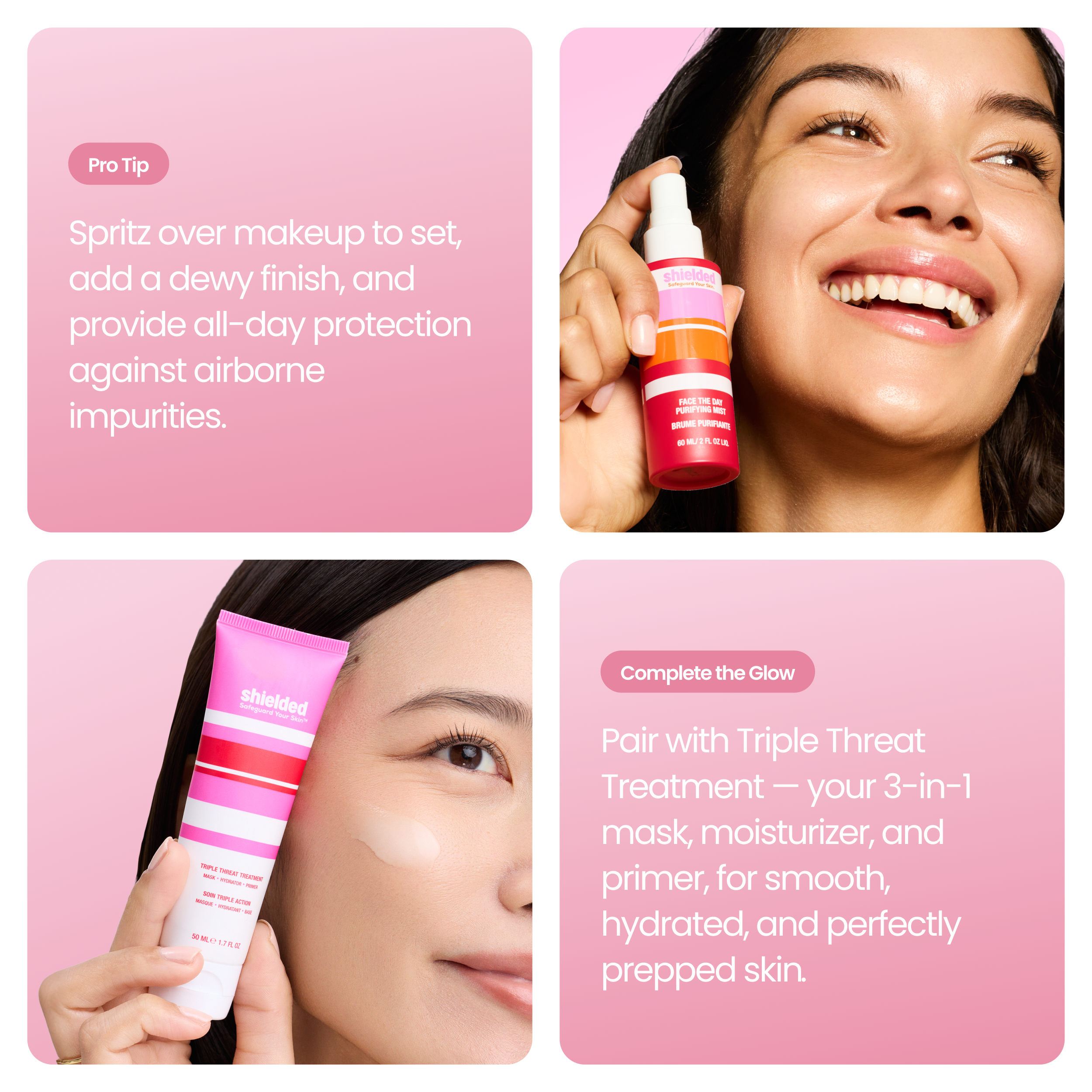Our shielded formula is renowned for its refreshing qualities and ability to create a non-sticky, second skin shield against harmful environmental invaders including blue light and UV rays. Clinically-proven to be safe for all skin types, results from an independent dermatologist-tested study found zero evidence of irritation or hypersensitivity. Perfectly sized for on-the-go, this mist is your ultimate skincare companion- with just a few spritzes, you can combat airborne impurities and face the day.